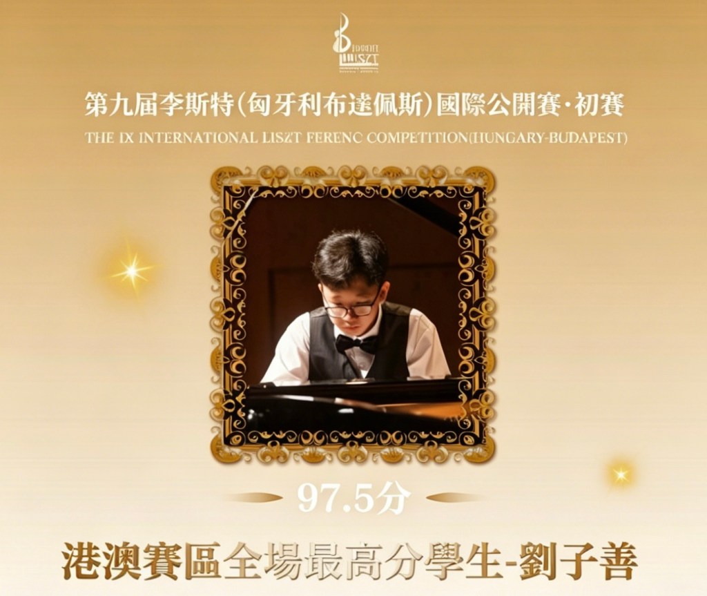劉子善同學勇奪初賽全場最高分 97.5 分!獲港澳區全場最高分 97.5 分並獲贈送國際機票一張(價值 HKD11600)
